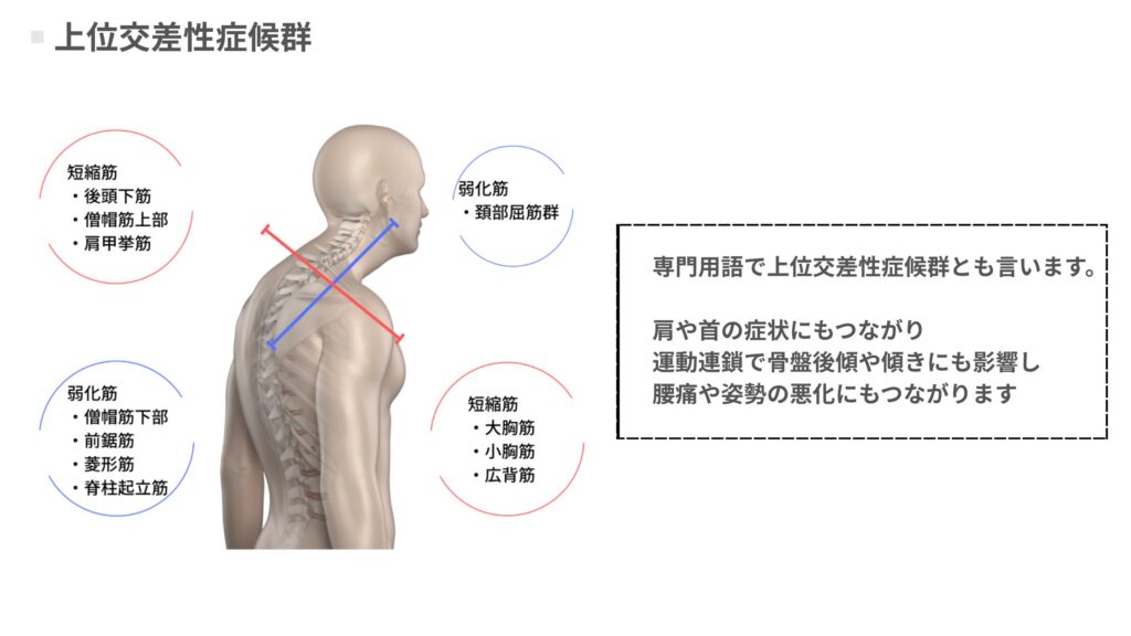 つまり、「体の前側の筋肉が硬く」「背面やインナーマッスルが弱くなる」状態です。