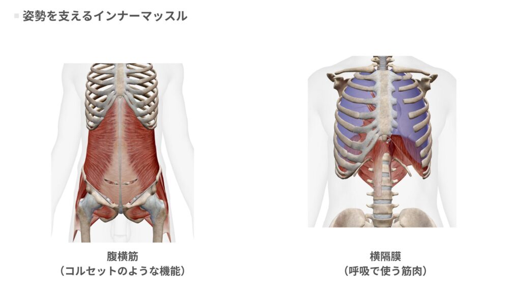 横隔膜(Diaphragm) | 呼吸と姿勢安定を連動 | 呼吸が浅いと姿勢も崩れる |