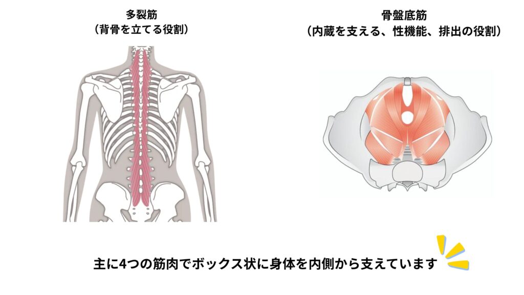 多裂筋(Multifidus) | 背骨の間を細かく支え、姿勢保持 | 背筋を張るよりも「背骨を立てる」感覚 |