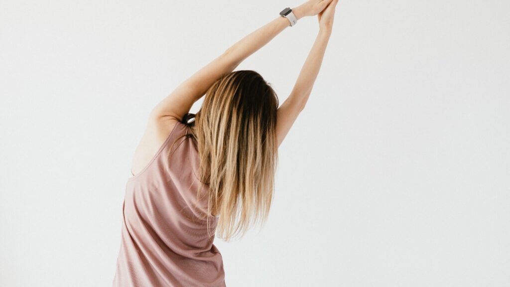 - 両手を頭の上で組み、息を吸いながら背筋を伸ばす