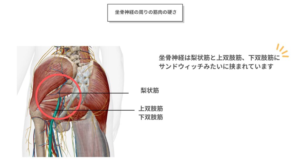 お尻の奥にある**梨状筋(りじょうきん)**は、