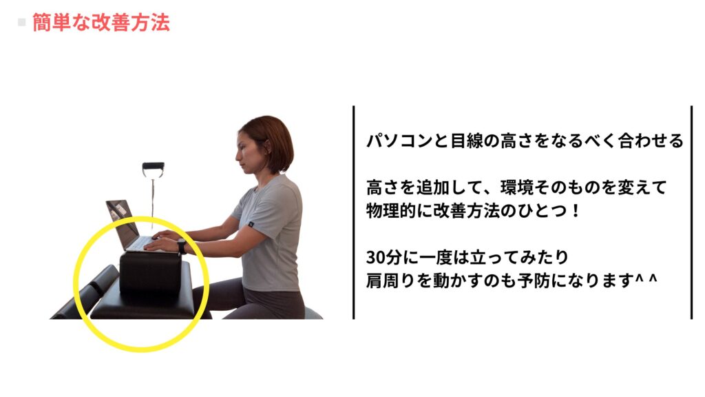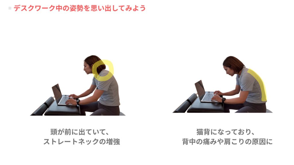 デスクワーク中は背骨全体が丸まりやすく、猫背姿勢 になりがちです。猫背は胸が潰れて呼吸が浅くなるため、酸素不足による集中力低下や、自律神経の乱れも引き起こします。