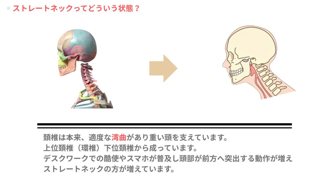 通常、首の骨は前方に緩やかなカーブ(前弯)を描いています。しかし、前傾姿勢が続くと首が前に突き出し、このカーブが失われ「ストレートネック」と呼ばれる状態になります。